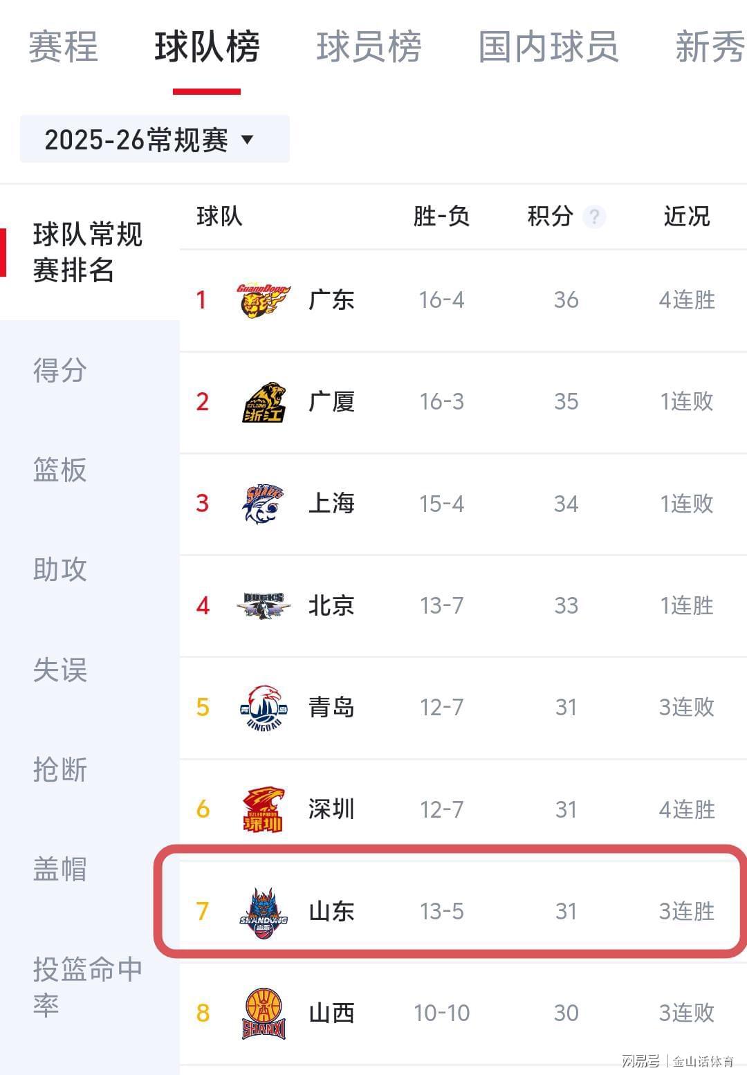 翻开CBA积分榜,截止目前,排在积分榜前8名的球队,分别是广东、广厦、上海、北京、青岛、深圳、山东和山西。这其中,山东队以13胜7负,排在积分榜第7位。但实际上,山东队已取得13场胜利,之所以排在12胜的青岛和深圳队之后,是因为他们少赛一场。因此,他们在未来几轮后,积分排名大概率会向前挪动,甚至有可能进入4强之列(目前山东队胜场,与第4的北京队相同。)。