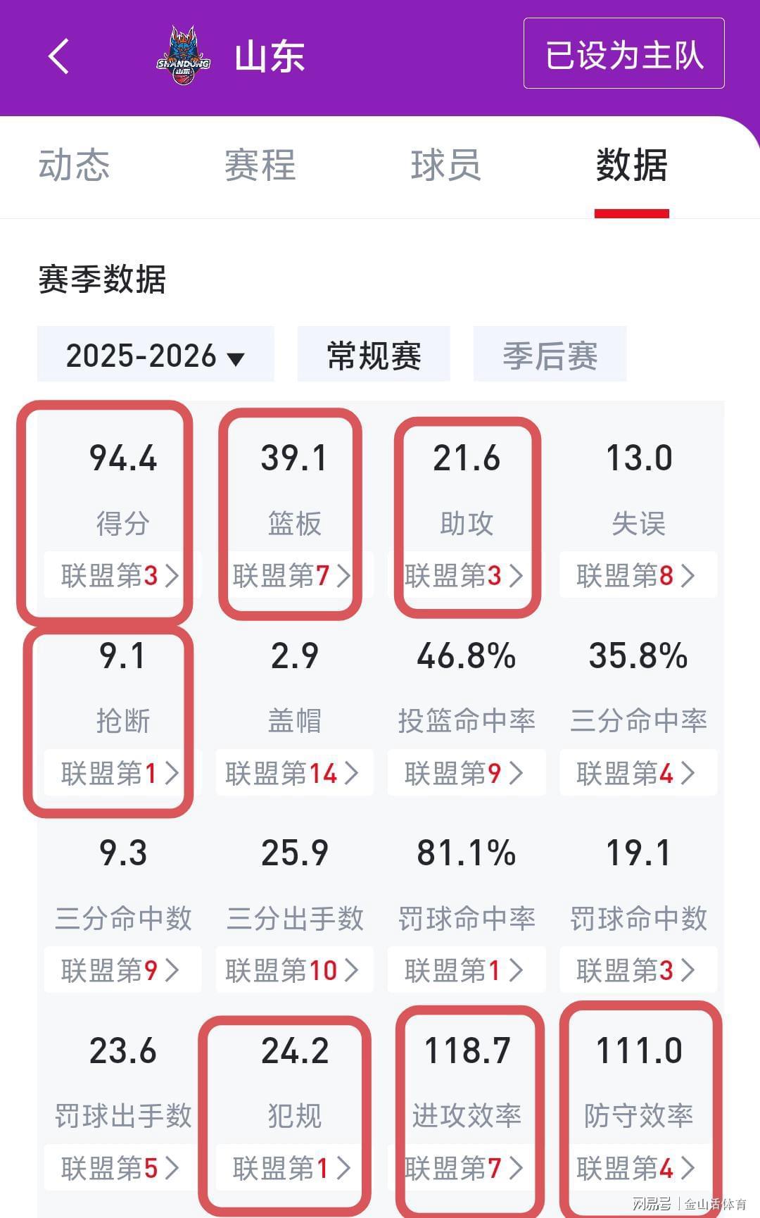 山东队防守质量的提升,从几方面可以体现。一是山东队的场均犯规次数为24.2次,排全联盟第一,这从侧面反映出该队的防守强度;二是山东队的抢断,场均9.1次,同样排在联盟第一,这也是防守侵略性的体现;第三个山东队的防守效率,排在全联盟第四位。与此同时,山东队的场均助攻、得分,以及进攻效率,均在全联盟名列前茅。